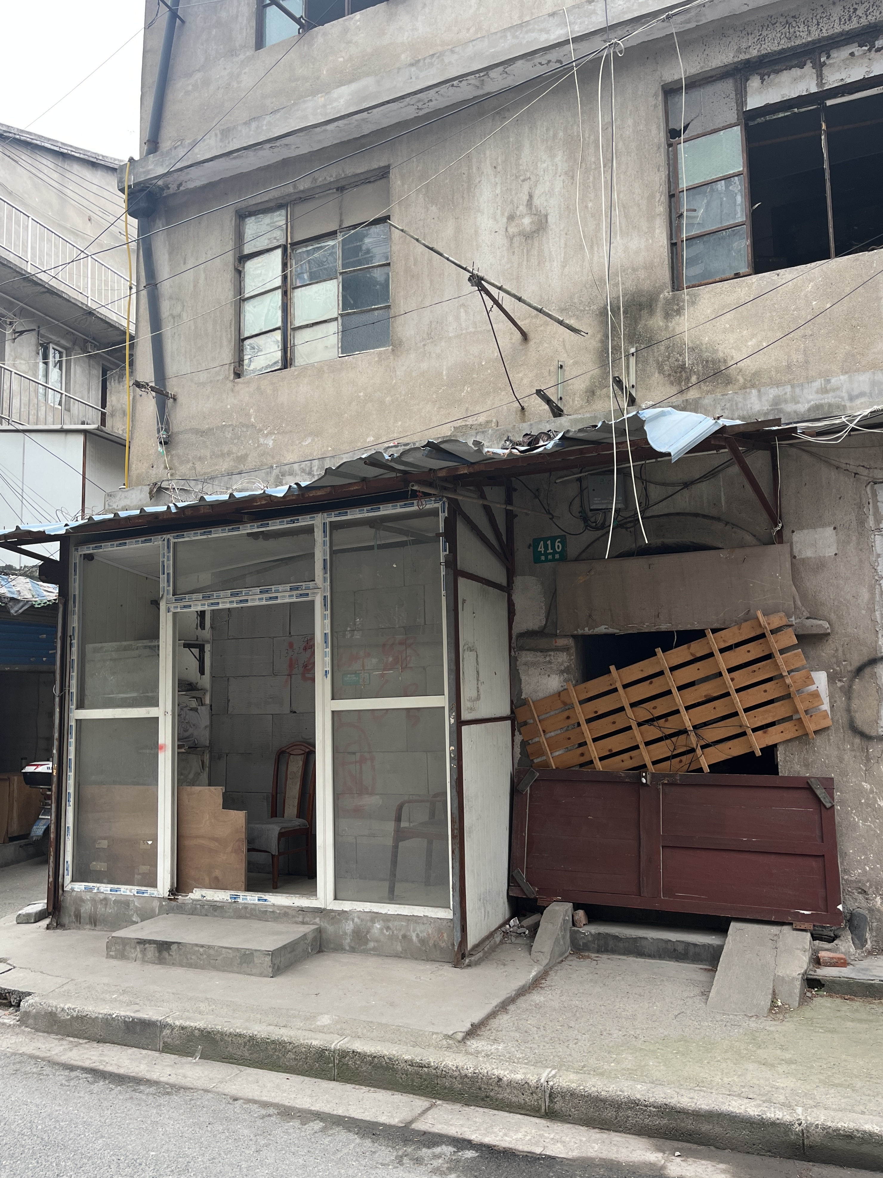 During this fieldwork, I mainly used analogue photography to capture the changes in these places, as it was one of the quickest and most direct means of documentation when facing unforeseen circumstances. I also want to experiment with the physicality of the negative when producing prints from them later. I photographed several urban village buildings that were on the verge of demolition, such as the "Patchwork House" on Gongjiazhai Road in Hongkou district, dating back to the 1960s. Due to constant repairs, its exterior facade resembled a collage, with evident traces of grassroots self-repair - patches on the roof, patches on the outer walls, and patches on the windows - juxtaposed with the original texture, resulting in a form that emerged from instinct rather than deliberate design. The ground floor of this building used to be a hardware store facing the street, where I purchased things in 2018. Reflecting on it now, I can't help but be astonished by the rapid pace of urban renewal. This reminded me of what David Harvey once said, "For us, the city is like an ever-changing map." The urban form we see at this very moment is just its current appearance.
